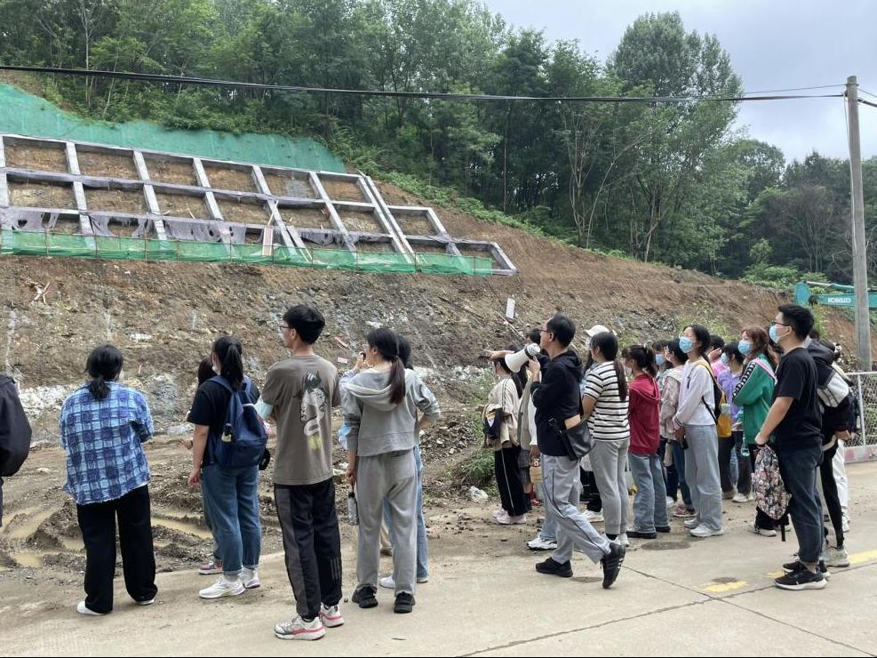 2023年5月30日,beat365中文官方网站土木工程系、道路与桥梁工程系组织土木工程专业2021级本科生、道路桥梁与渡河工程专业2020级和2021级本科生前往震雷山、浉河景观带示范段工程茗阳路项目工地开展工程地质、路基路面实习。