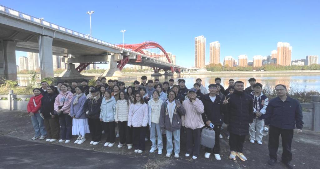 实习路线自浉河上游启程,依次考察二号新桥、彩虹桥、民桥、十八大街高架跨浉河桥及琵琶台琴桥,并同步完成沿线道路实地调研。行进途中,指导教师结合工程案例,系统讲解道路桥梁“规划—设计—施工—运营—维护”全生命周期关键技术与管理要点;学生通过现场观察与结构比对,直观体悟工程实践的复杂性与多样性,课堂知识得以情境化重构。