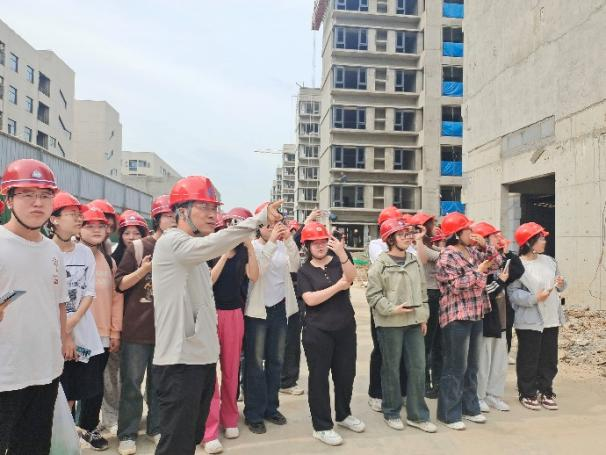 抵达现场后,现场负责人介绍了工程概况,带领同学们参观了正在施工的住宅楼小区,结合现场施工进度,详细为同学们讲解了现场建筑材料、施工机械、绿色施工(洗车台、雾炮机,自动喷淋系统,扬尘监测系统)、填充墙及构造柱的施工工艺、安全文明施工、配电箱、强弱电井、外墙粉刷、外脚手架搭设、屋顶女儿墙、泛水、排水沟、无动力风帽、伸缩缝等实践知识。
