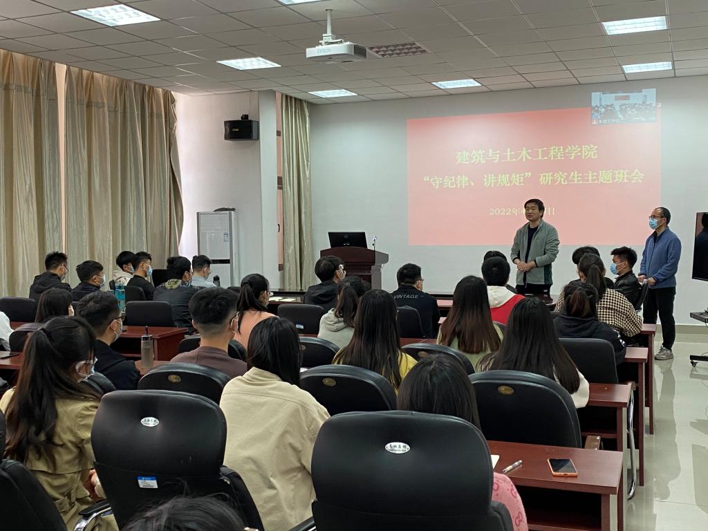 2022418日下午2点,beat365中文官方网站召开了研究生“守纪律、讲规矩主题班会。研究生主管院长肖琪聃、研究生班主任马文强和全体研究生线下线上参加了本次班会,会议由马文强主持。