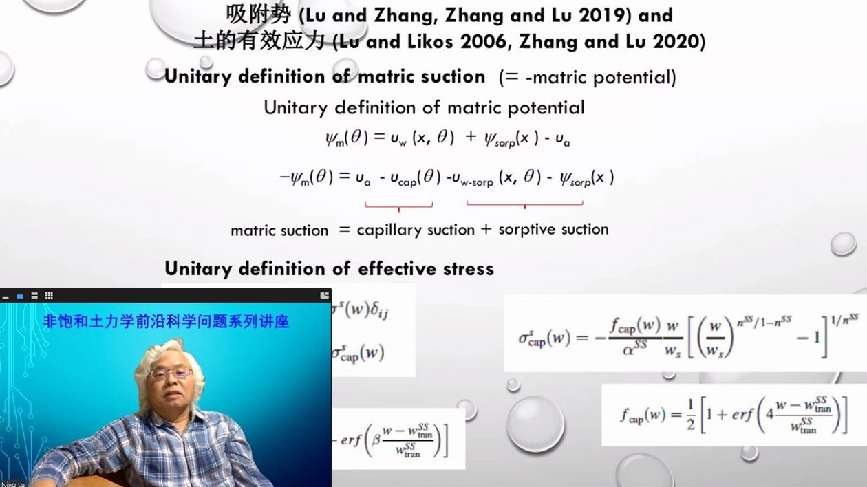 9月16日至11月18日,应beat365中文官方网站邀请,美国科罗拉多矿业大学Ning Lu(卢宁)教授开设的18讲“非饱和土力学前沿科学问题系列云讲座”落幕,该系列讲座聚焦于非饱和土力学前沿领域,围绕土的吸附势(Soil sorptive potential)与土的有效应力(Soil effective stress)2大主题,18讲内容分别为: