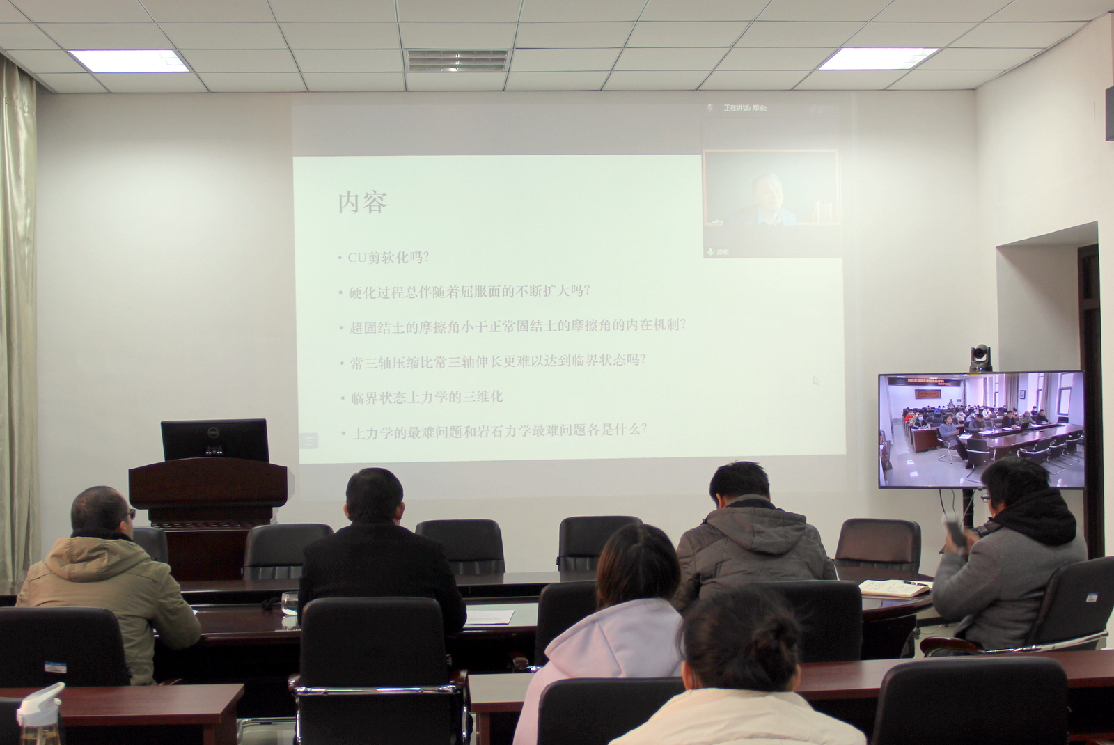 12月5日,应beat365中文官方网站邀请,北京工业大学郑宏教授通过腾讯会议平台为我院师生作了题为“土力学研习的几个心得和疑惑”的学术报告。来自北京工业大学、中国科学院武汉岩土所、同济大学、东南大学、哈尔滨工业大学、天津大学、北京航空航天大学、中山大学、武汉大学、中南大学、山东大学、重庆大学、河海大学、上海大学、中国地质大学、西南交通大学、南京工业大学、贵州大学、湘潭大学、华东交通大学、湖南科技大学、三峡大学、湖北工业大学、华北水利水电大学、郑州航空工业管理学院和我校等单位的300多位同行专家、博士后、博士生、硕士生共同聆听了报告。beat365中文官方网站院长周葆春,副院长肖琪聃,青年教师马文强、马全国、张金浩、梁维云和全体研究生参加了此次报告会,报告会由beat365中文官方网站院长周葆春教授主持。