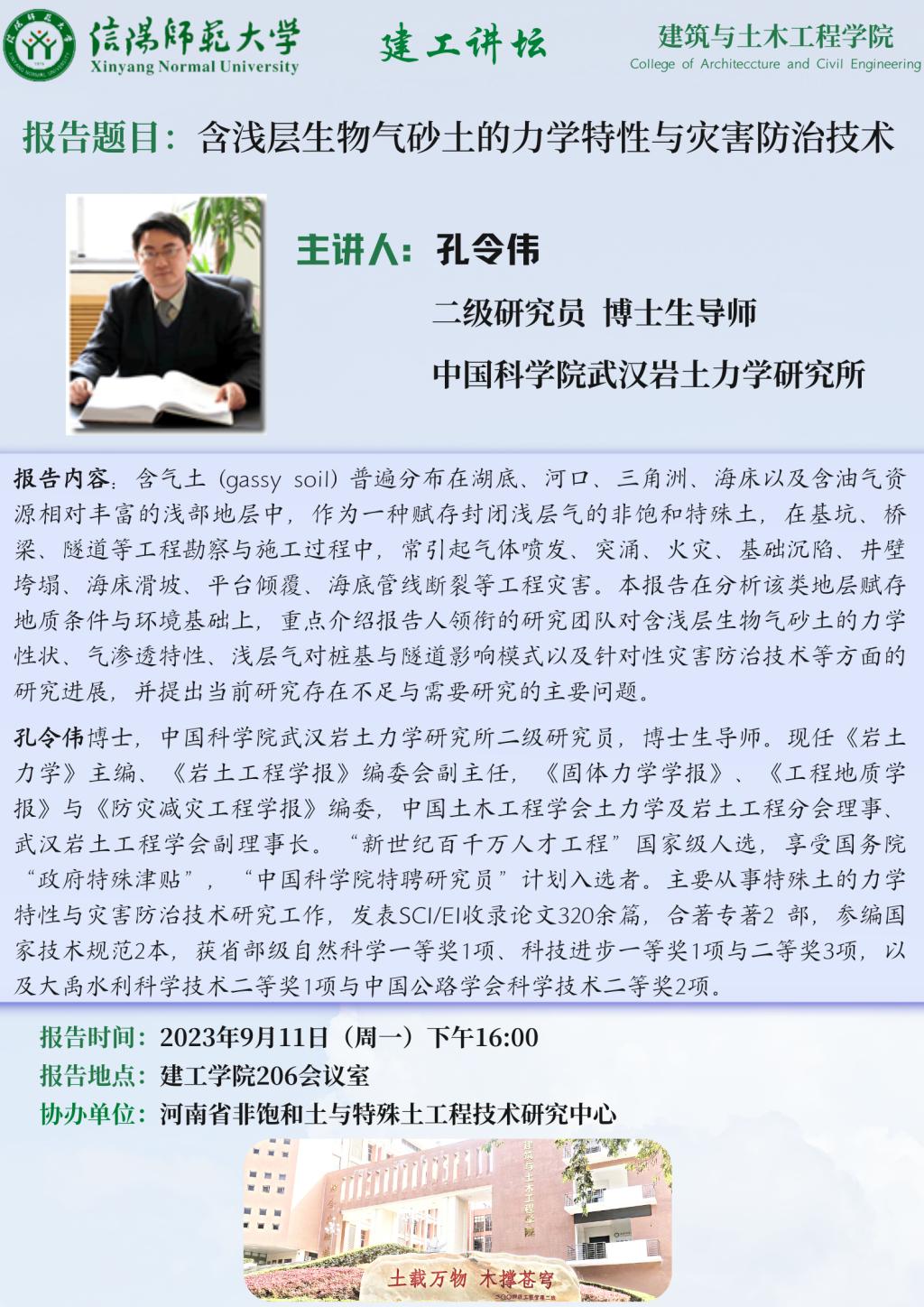 报告人简介:孔令伟博士,中国科学院武汉岩土力学研究所二级研究员,博士生导师。现任《岩土力学》主编、《岩土工程学报》编委会副主任,《固体力学学报》、《工程地质学报》与《防灾减灾工程学报》编委,中国土木工程学会土力学及岩土工程分会理事、武汉岩土工程学会副理事长。“新世纪百千万人才工程”国家级人选,享受国务院“政府特殊津贴”, “中国科学院特聘研究员”计划入选者。主要从事特殊土的力学特性与灾害防治技术研究工作,发表SCI/EI收录论文320余篇,合著专著2 部,参编国家技术规范2本,获省部级自然科学一等奖1项、科技进步一等奖1项与二等奖3项,以及大禹水利科学技术二等奖1项与中国公路学会科学技术二等奖2项。