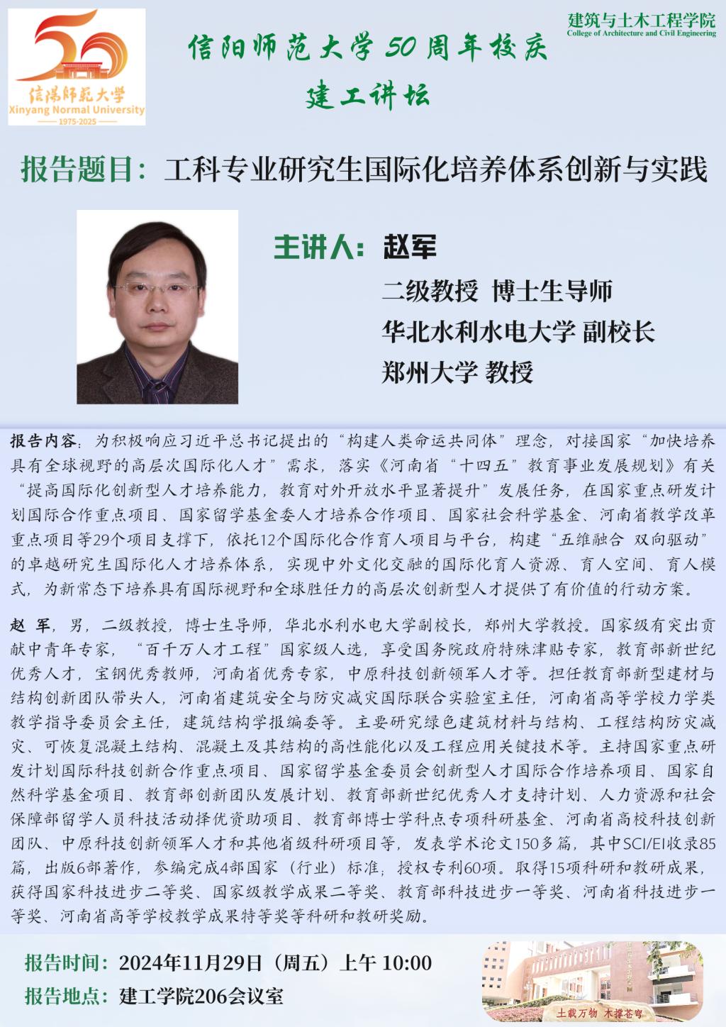 报告人简介:赵 军,男,二级教授,博士生导师,华北水利水电大学副校长,郑州大学教授。国家级有突出贡献中青年专家,“百千万人才工程”国家级人选,享受国务院政府特殊津贴专家,教育部新世纪优秀人才,宝钢优秀教师,河南省优秀专家,中原科技创新领军人才等。担任教育部新型建材与结构创新团队带头人,河南省建筑安全与防灾减灾国际联合实验室主任,河南省高等学校力学类教学指导委员会主任,建筑结构学报编委等。主要研究绿色建筑材料与结构、工程结构防灾减灾、可恢复混凝土结构、混凝土及其结构的高性能化以及工程应用关键技术等。主持国家重点研发计划国际科技创新合作重点项目、国家留学基金委员会创新型人才国际合作培养项目、国家自然科学基金项目、教育部创新团队发展计划、教育部新世纪优秀人才支持计划、人力资源和社会保障部留学人员科技活动择优资助项目、教育部博士学科点专项科研基金、河南省高校科技创新团队、中原科技创新领军人才和其他省级科研项目等,发表学术论文150多篇,其中SCI/EI收录85篇,出版6部著作,参编完成4部国家(行业)标准;授权专利60项。取得15项科研和教研成果,获得国家科技进步二等奖、国家级教学成果二等奖、教育部科技进步一等奖、河南省科技进步一等奖、河南省高等学校教学成果特等奖等科研和教研奖励。