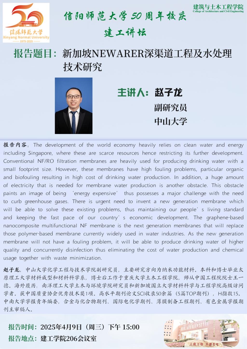 报告人简介:赵子龙,中山大学化学工程与技术学院副研究员,主要研究方向为纳米功能材料。本科和博士毕业太原理工大学材料成型和材料科学系,博士后工作于重庆大学土木工程学院,师从中国工程院院士王一德。海外履历:南洋理工大学土木与环境学院研究员和新加坡国立大学材料科学与工程学院高级访问学者。获中国质量协会优秀技术奖1项。高水平期刊论文SCI收录50余篇(5篇TOP期刊),H指数15。中南大学学报青年编委,合金与化合物期刊、国际电化学期刊、薄膜制备工程期刊、有色金属学报期刊主审稿人。