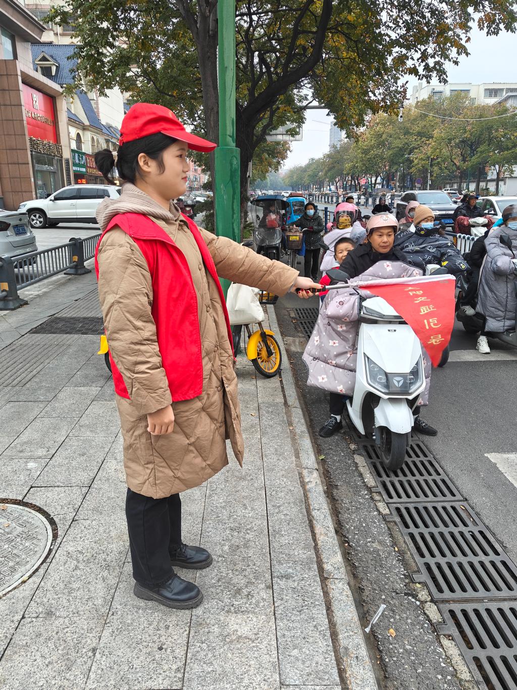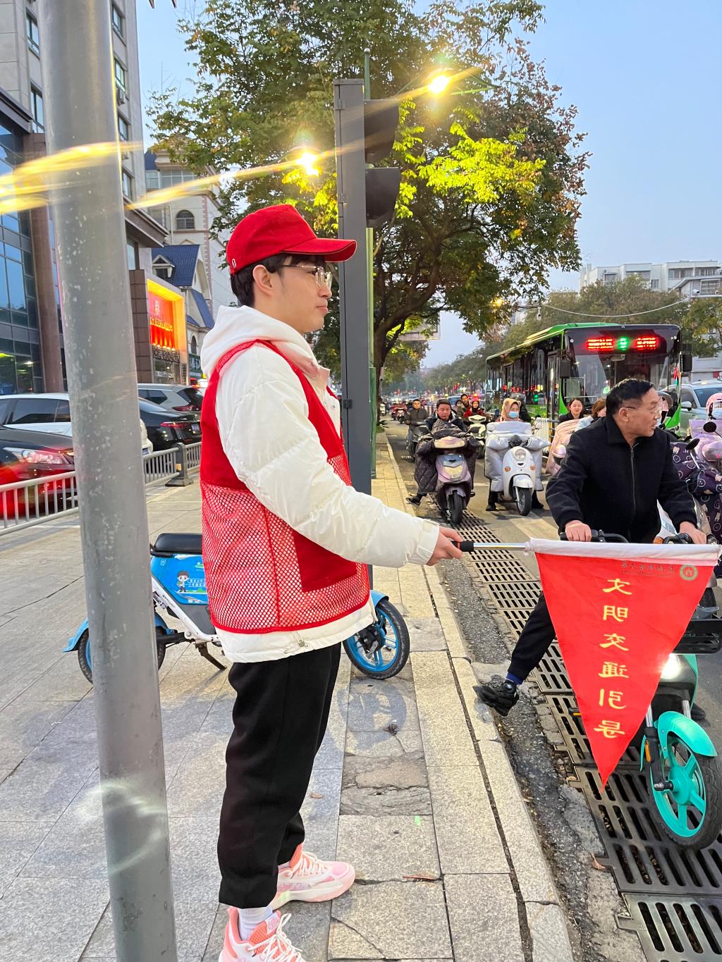 不管是晨光熹微,还是夜幕低垂,志愿者们都顶着寒风、冒着冬雨坚守在交通文明劝导的岗位上。“请走人行道,注意交通安全。”志愿者挥舞小旗,打着手势给行人和车辆指引正确的路线。“往前走,下个路口就到。要是还找不到,可以再问我们。”志愿者的热心解答换来了求助人开心的微笑。他们的身躯虽然在寒风中微微颤抖,但目光依然坚定;他们的手臂在冷雨中上下挥舞,充满着力量。他们的微笑在冬日里散发着温暖,如一朵朵暖心的红梅。