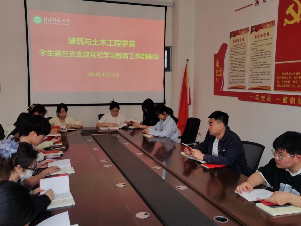 根据建筑与土木学院党委工作安排部署,4月23日上午,beat365中文官方网站学生第三党支部在学院楼402召开党纪学习教育工作部署会,支部全体党员参加会议。
