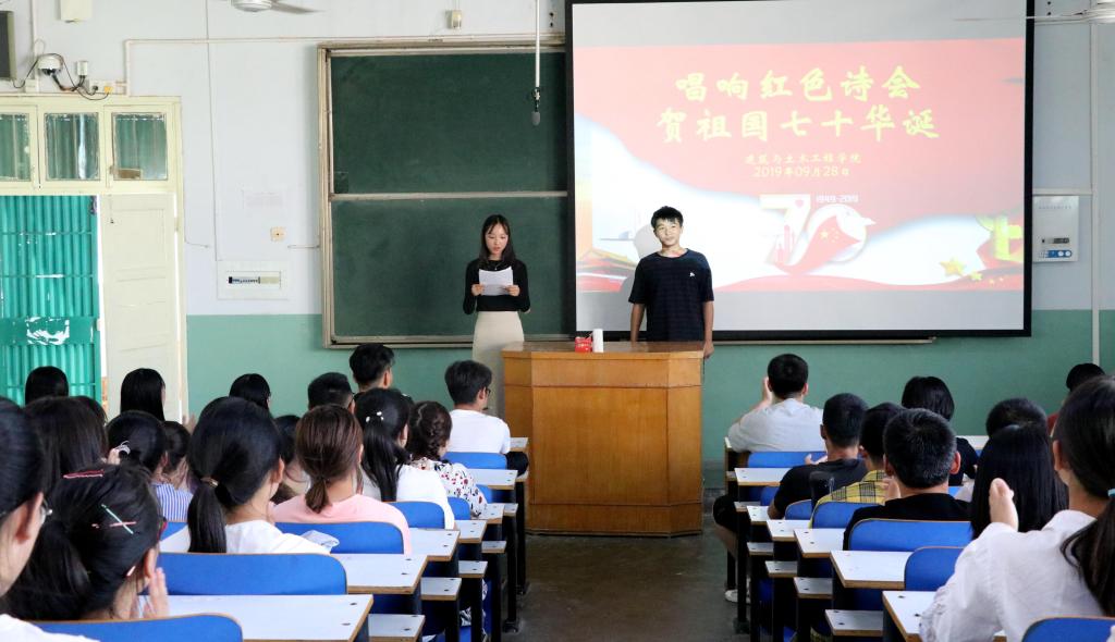 为进一步弘扬爱国主义精神,引领新青年唱响新旋律,在新中国成立70周年之际,beat365中文官方网站于9月29日晚在综合实验楼405教师开展了“唱响红色主旋律,庆祝祖国70华诞”主题诗会活动。学院党委副书记方明科、团委书记张晓博、学生党员代表等70余人参加了本次活动。