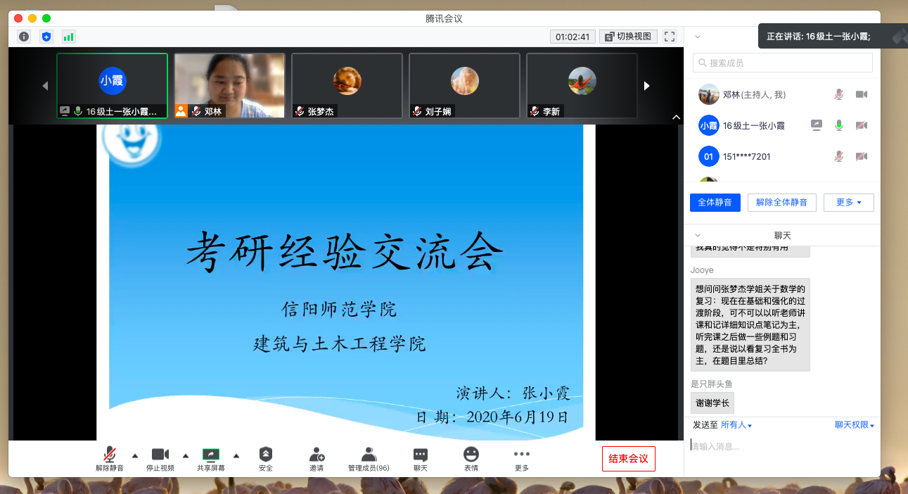 为进一步为计划考研的同学们提供更多的信息,帮助同学们树立正确的学习目标以及考研方向,我院在于6月19日下午3点通过网络召开了2020年考研经验交流会。会上,邀请了在2020年全国研究生统一招生考试中获佳绩的刘子娴、张小霞、张梦杰、陈硕硕和张钰杭五位同学以及2017级130余名学生参加了本次交流会,会议由2017级班主任邓林主持。