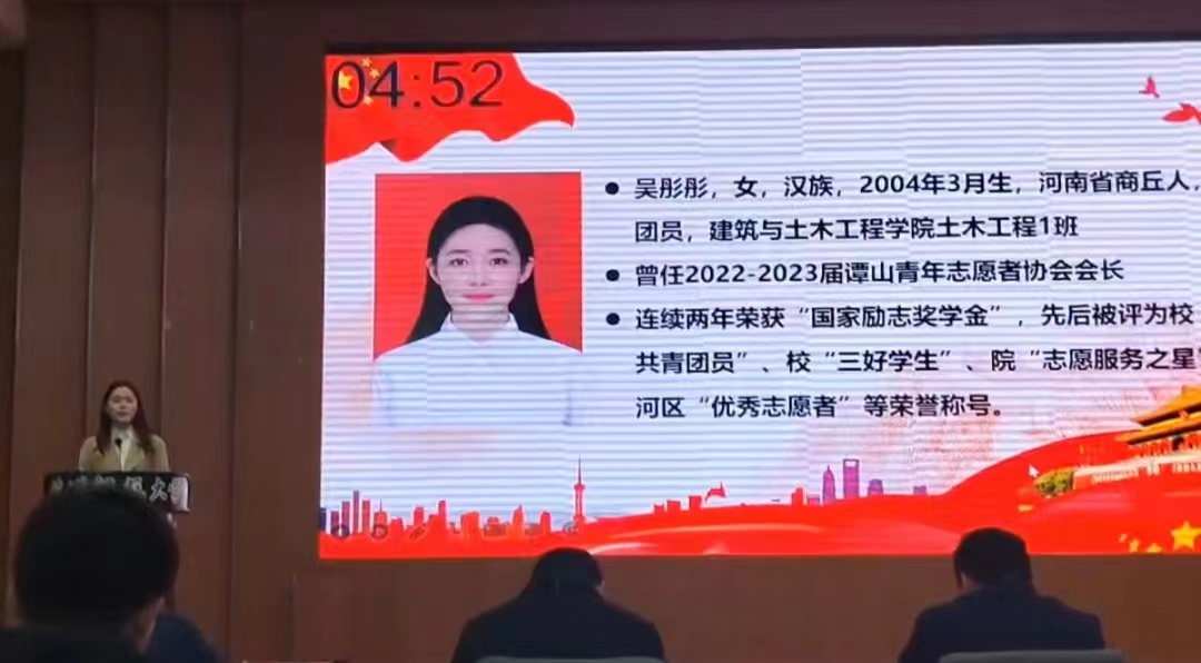 12月12日,信阳师范大学第一届大学生“自强之星”评选活动在逸夫楼报告厅举办。经过激烈角逐,我院谭山青年志愿者协会会长、中共预备党员、2021级土木工程1班学生吴彤彤脱颖而出,被评为学校第一届大学生“自强之星”。