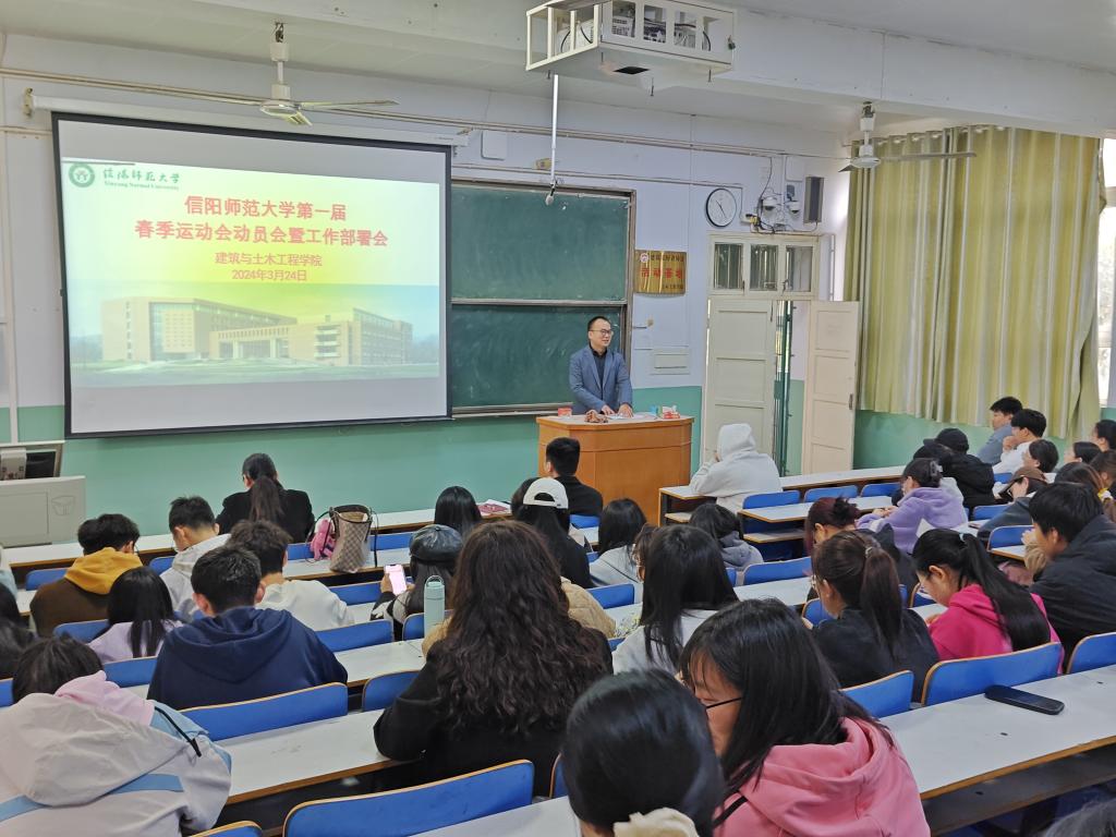 为认真做好春季运动会准备工作,充分调动学生的参赛热情,3月24日,beat365中文官方网站在教2T5召开信阳师范大学第一届春季运动会动员会,学院党委副书记冀鹏,团委老师冯舒心,学院各班级学生代表参加会议。