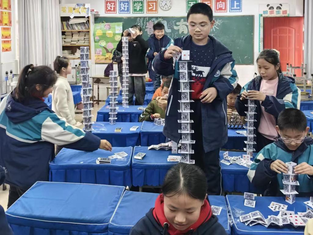 志愿者们带领孩子们在篮球场做热身准备和运球基本功训练,在掌握了基本的运球技术之后,又进一步提高了教学难度,分小组进行“传球”小游戏比赛,培养孩子们的竞争意识和团结意识;工程管理协会志愿者与孩子们玩起了"击鼓传花"游戏,志愿者拍鼓,同学们快速传花,鼓声停,花落到谁的手里,谁就给大家表演节目,发掘孩子们多才多艺的一面;建筑爱好者协会为大家介绍基本建筑知识,并手把手教他们用纸牌搭建简易的建筑模型,看谁搭的又高又稳,在欢声笑语中锻炼孩子们的耐心和毅力。