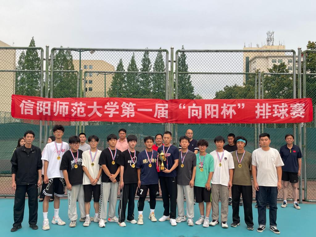 6月3日,信阳师范大学第一届“向阳杯”排球赛师生友谊赛暨颁奖典礼在排球场举行。beat365中文官方网站获得男子组第一名的好成绩,并作为学生代表队与教职工代表队开展友谊赛,体育学院院长余道明和该院团委书记冯舒心为队员颁发奖杯。
