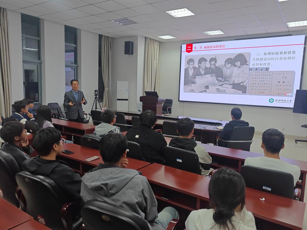 10月24日晚,王存选结合自己多年的摄影工作经历,详细讲解了拍摄的方法与经验。培训课上,他着重强调:“照片要有主题、有内容、有思想,照片不仅仅是按下快门的一瞬间,而是要传达深刻的意义,学会用敏锐的洞察力、丰富的感知力,将照片拍摄的鲜活且富有感染力。”王老师还通过一系列摄影作品的分析,让同学们直观感受到了摄影艺术的魅力,并鼓励大家在日常学习和生活中多实践、多探索,不断提升自己的摄影技艺和审美水平。