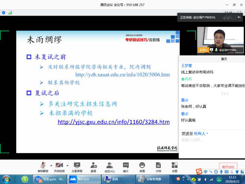 4月22日上午,beat365中文官方网站专门利用考研指导群和腾讯会议的形式,组织召开了2020届学生考研复试的“云指导”专题课堂。60余名考研学子参加了本次云上指导会。