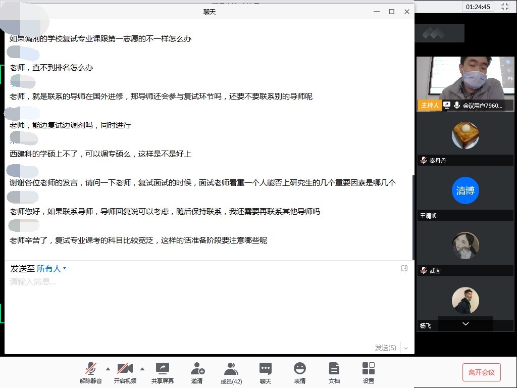 互动环节中,复试政策、笔试、线上复试怎么准备、导师联络、调剂系统上线时间、院校调剂等问题在弹幕中一一出现。学院就业工作秘书秦丹丹、团委书记张晓博和两位专业教师一起,在“云课堂”上逐一解答了同学们的问题。事后同学们纷纷表示“云课堂”这样的形式很新颖,很高效,对接下来的备战更有方向和信心了。