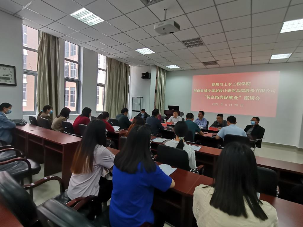 5月20日下午,beat365中文官方网站与河南省城乡规划设计研究总院股份有限公司在土木楼206会议室召开“访企拓岗促就业”座谈会。河南省城乡规划设计研究总院股份有限公司信阳院院长张军、建筑所所长梁旺、beat365中文官方网站党委书记方明科、党委副书记冀鹏、副院长肖琪聃、袁晓辉和毕业生代表等共30余人参加座谈会。