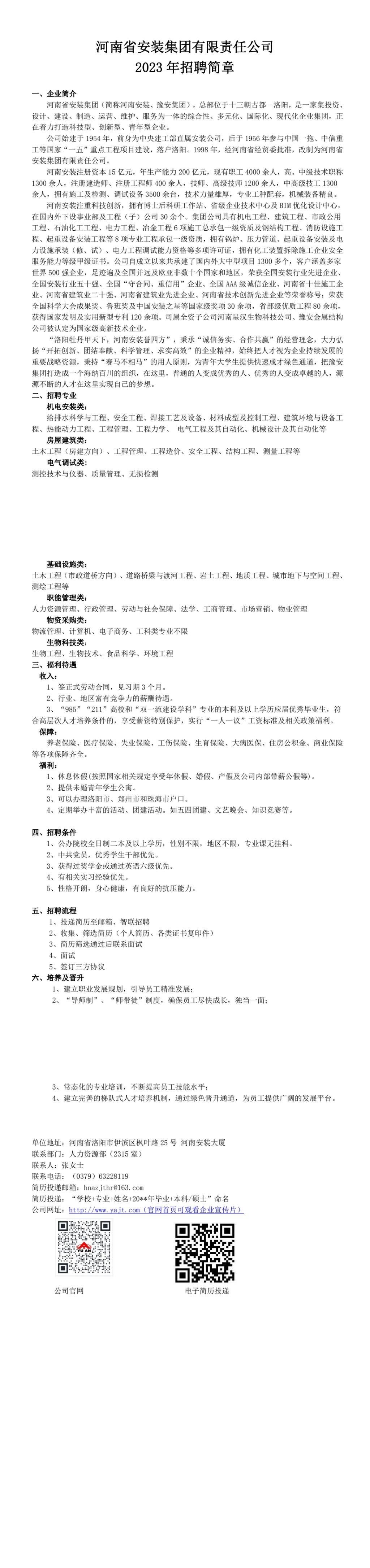 河南省安装集团有限责任公司2023年招聘简章