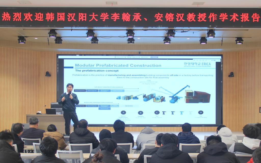 Ahn Yong-Han教授作题为 “The Construction Paradigm Shift: AI & Digital Transformation in Modular Construction”的学术报告。Ahn教授围绕模块化建筑在应对建筑行业劳动力短缺、生产效率停滞、安全风险突出、质量不稳定及成本超支等问题中的应用实践,系统阐述了智能建造的发展路径。他指出,以模块化预制为核心,融合BIM、人工智能和物联网等数字技术,可实现建筑全生命周期的系统性变革。该模式兼具快速、高效、智能与绿色等优势,已在韩国、新加坡、香港等国家和地区取得显著成效。Ahn教授强调,人工智能与数字化转型是推动建筑产业升级的关键驱动力,对提升施工效率、控制工程成本、保障质量安全以及实现行业可持续发展具有重要意义。