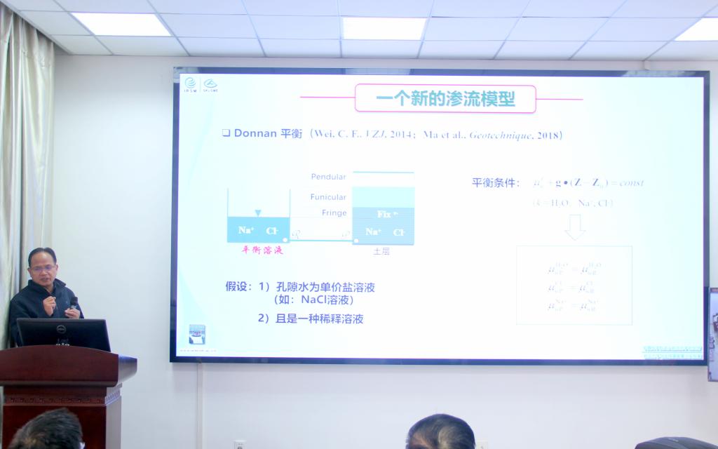 报告会上,韦昌富研究员以达西定律与孔隙流体质量平衡方程结合构成的流动模型为背景,介绍了这类渗流模型存在的缺陷,并讨论了这些缺陷出现的根本原因;然后介绍了一种新的渗流模型,并从理论和实验上证明了其自洽性与有效性;最后通过几个边值问题,介绍了所建模型的应用前景。